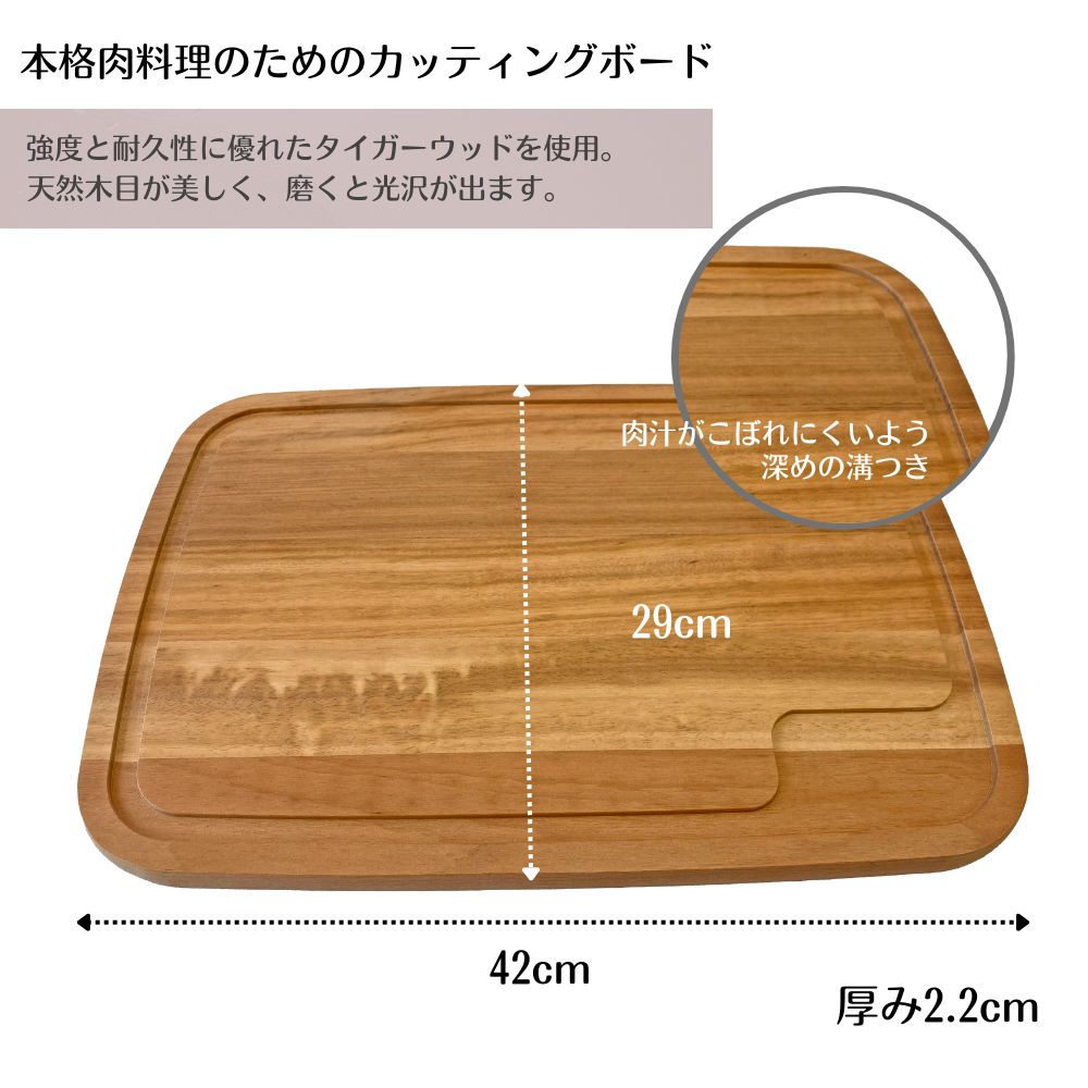 タイガーウッドを使用したこのまな板は、強度と耐久性に優れ、長く愛用できます。