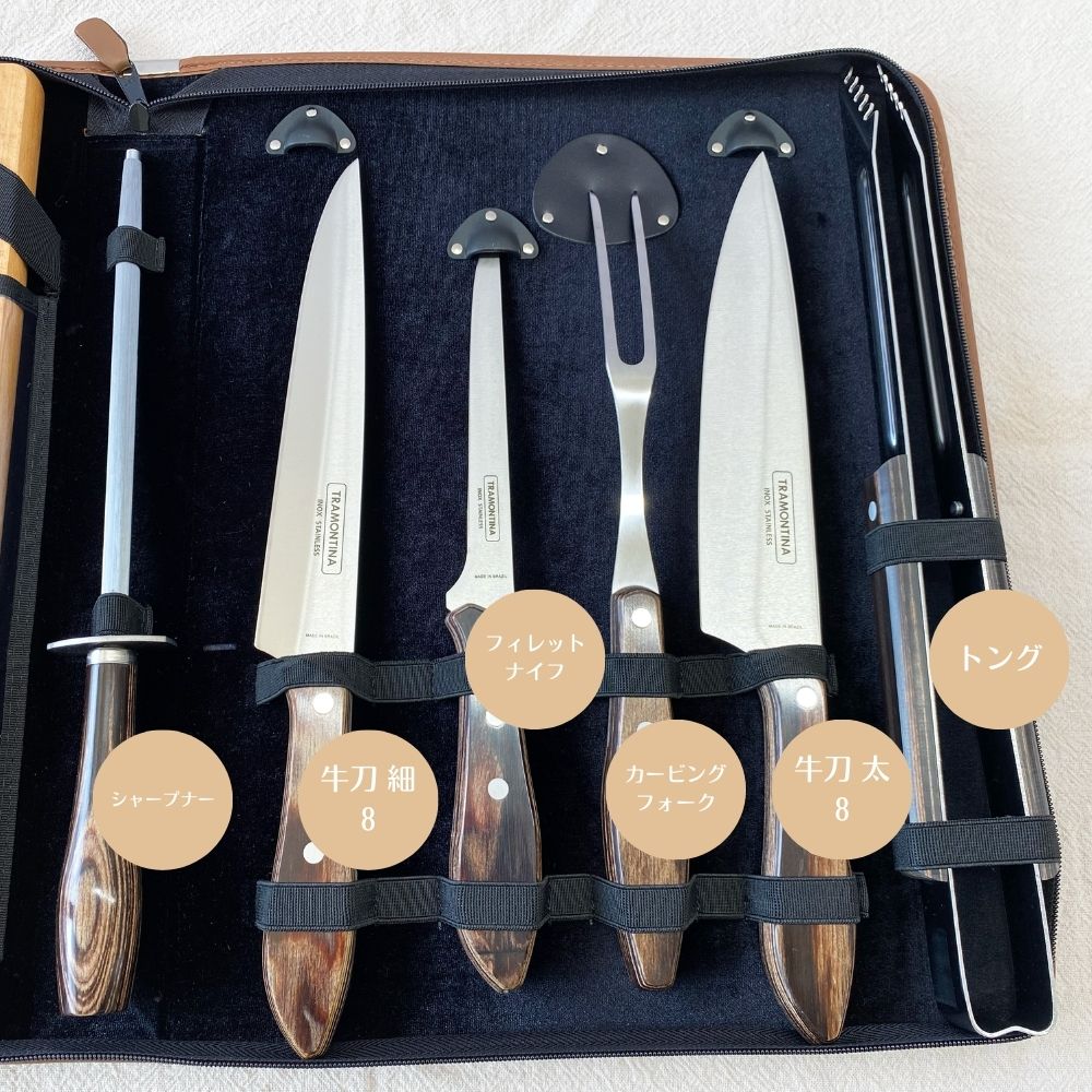 バーベキュー、BBQ、包丁、ナイフ、カトラリー、アウトドア、キャンプ、野外調理、グランピング、肉、肉切り、焼き物向け、ステーキ、骨付き肉、カービングナイフ、下ごしらえ、調理、野菜用、フィレ、多用途、セット、錆びにくい、高耐久、ケース付き、軽量、持ち運び便利、おしゃれ 、シンプル デザイン、木製ハンドル、滑りにくい、グリップ、安全設計 、プレゼント、ギフト、父の日、誕生日、新築祝い、キャンパー向け、コスパ、初心者向け、プロ仕様、人気、おすすめ、食洗器対応
